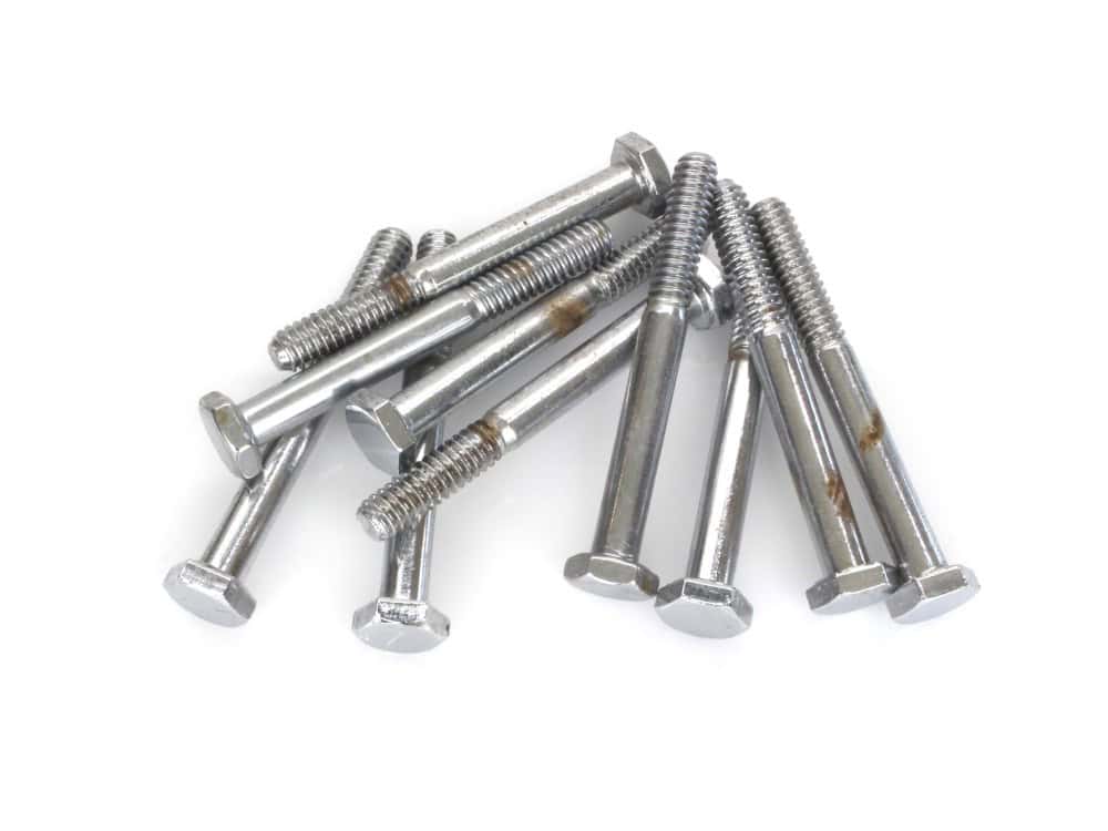 Assorted motorcycle hardware bolts for Revelry Motorcycles, high-quality stainless steel fasteners for custom bikes.