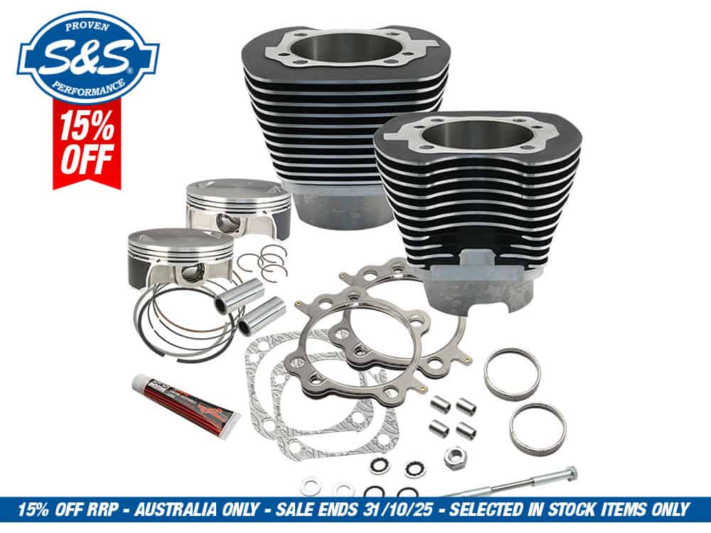 * This big bore cylinder and piston kit contains S&S 4-1/8″ bore cylinders and forged flat topped pistons, rings, wrist pins, head and base gaskets. The cylinders are machined with the stock bolt pattern and are inte nded for use in stock crankcases of 2007-2017 Twin Cam engines.
