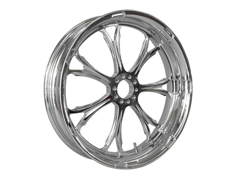 Shiny chrome motorcycle wheel, high-quality custom motorcycle parts from Revelry Cycles.