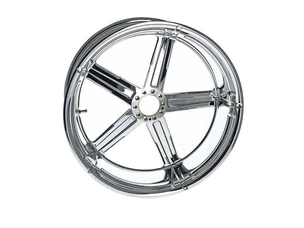 Chrome motorcycle wheel for custom Revelry Motorcycles builds, high-quality alloy design.