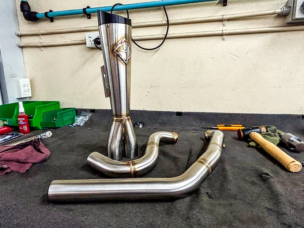 * 4″ rolled cone muffler with a 2 ¼ coiled perforated baffle for increased torque and a deep tone