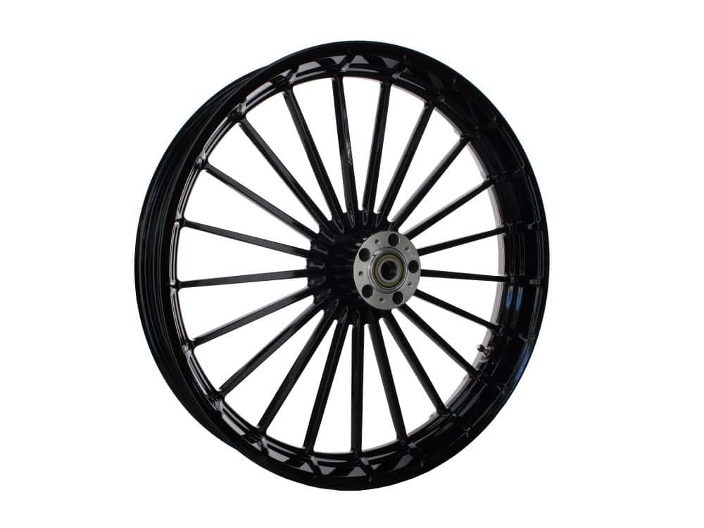 Black motorcycle wheel with spokes and hub for Revelry Motorcycles.