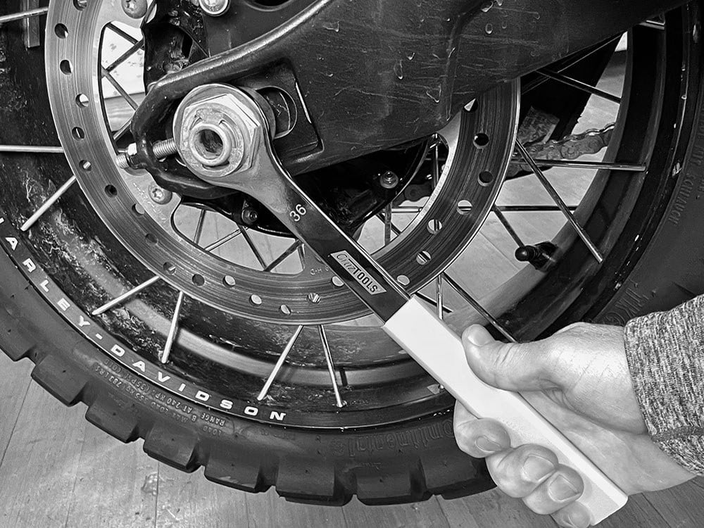 An innovative 36mm axle wrench with a light-weight aluminum extension to boost leverage while keeping it compact for easy storage on the bike. This specialty tool is designed to loosen the rear axle nut on Harley-Davidson Pan America, H-D Tourers 2008up, or Indian FTR motorcycles. The extension nests over the wrench for compact storage at 8.25″ in length and can be extended to 12″ for maximum leverage. The extension handle has finger-friendly radiused edges and a non-slip finish providing you wi th a solid grip. ItÂ’s an essential axle wrench for road-side tire repair or chain adjustments on any bike with 36mm axle nut. The narrow profile allows the rear axle nut to be loosened without removing the exhaust for easy belt adjustment on H-D bagger & Touring models 2008up.