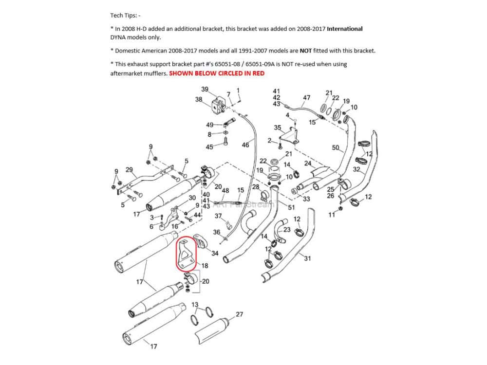 * In 2008 HD Added an Additional Bracket. This Bracket was Added on 2008 International Models Only. Domestic American 2008 Models and All 1991-2007 Models are Not Fitted with this Bracket. This Exhaust Support Bracket Part # 65051-08, 65051-09A is NOT utilised when using aftermarket mufflers.