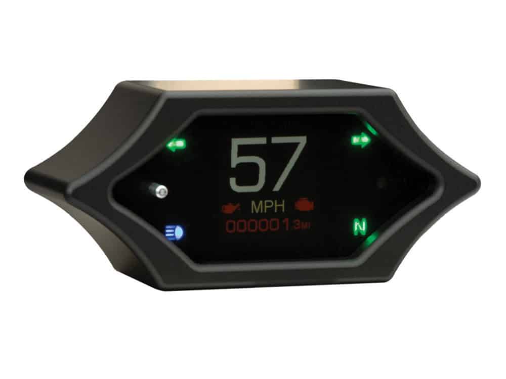 * Indicators for Left and Right Turn Signals, Highbeam, Neutral, Low Oil Pressure and Check Engine.