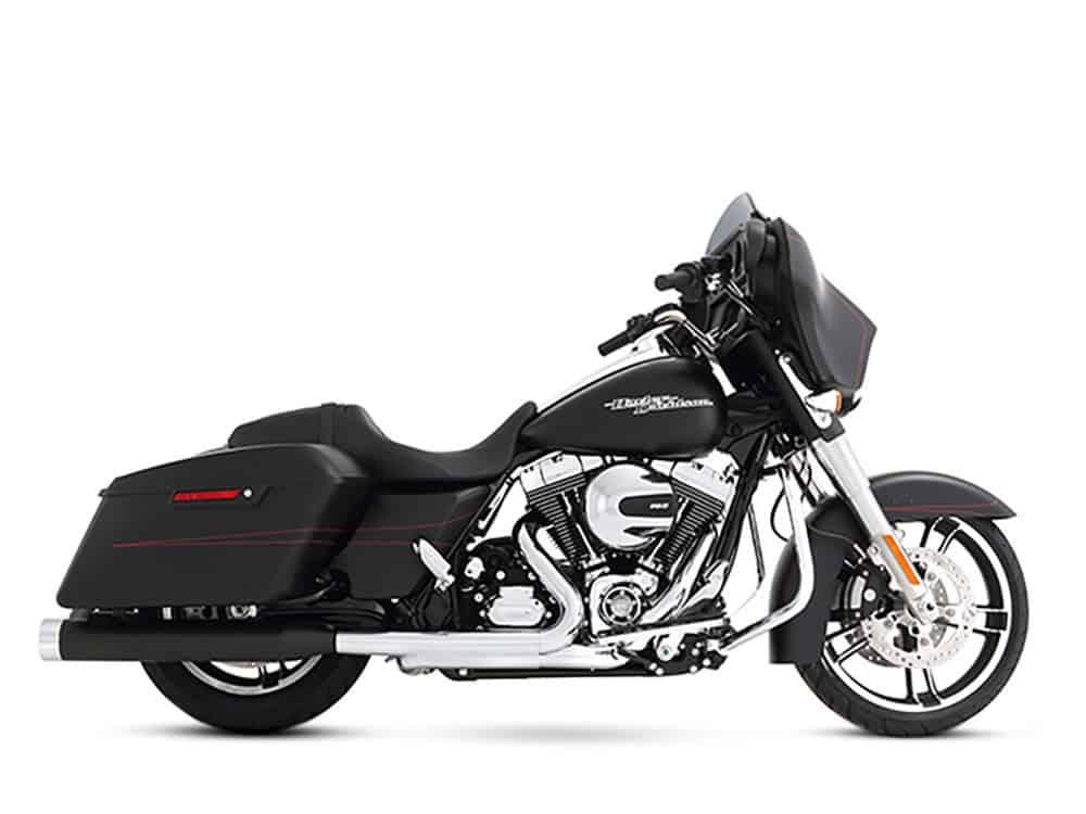 Vibrant red Harley Davidson touring motorcycle with custom exhaust and hard saddlebags.