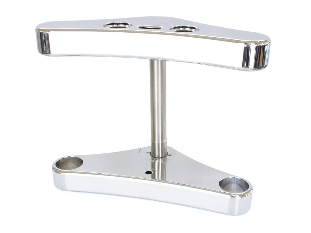 Polished motorcycle triple tree steering stem clamp for custom bikes.