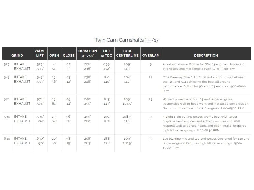 525 CAMS – A real workhorse, designed to increase torque band width and increase fuel economy. Great bolt in camshaft upgrade for stock 88 & 96 engines also performs very well in 103 strokers. Produces strong low and mid range power with a linear horsepower and torque curve. Can be used with factory valve springs, pushrods and lifters. Increases throttle response and eases starting. Will also respond well to increased compression and cylinder head work. RPM 1,750 – 5,500