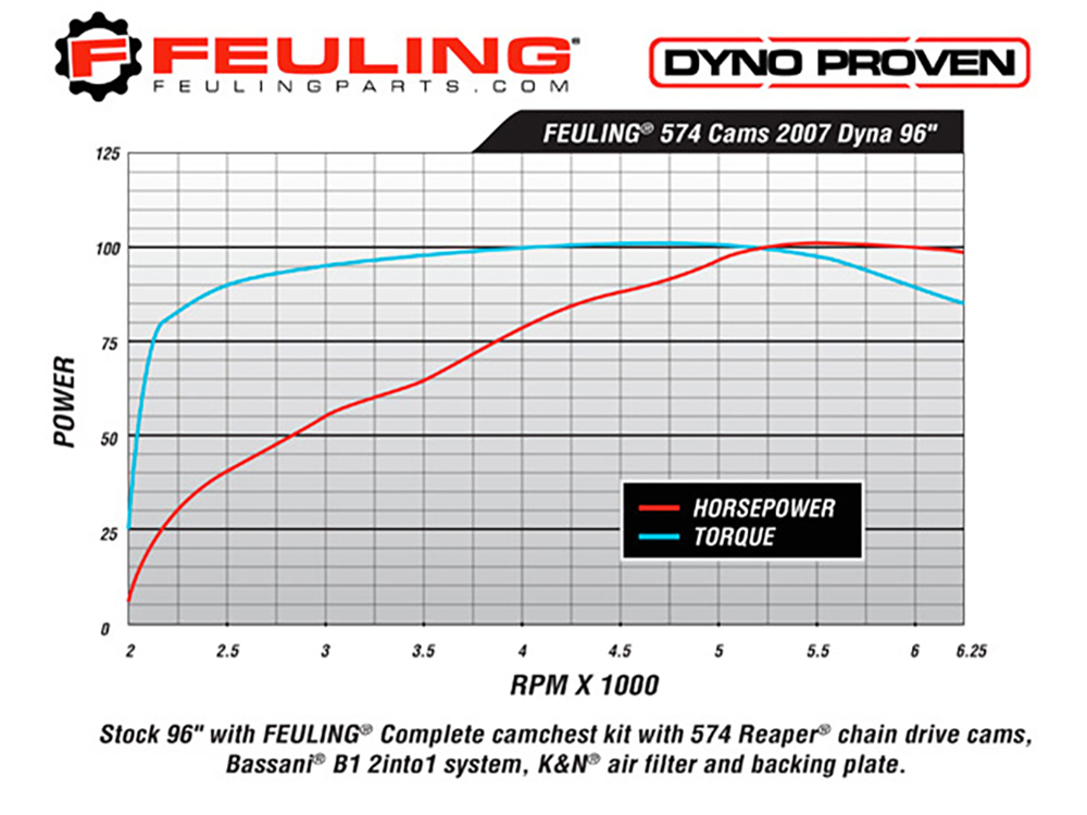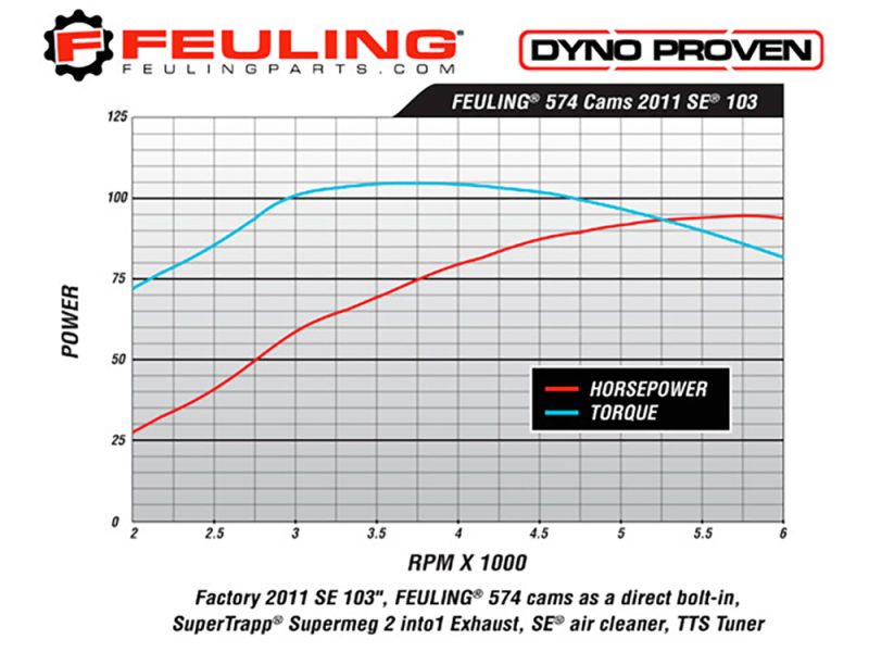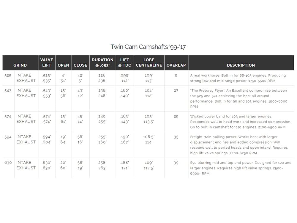 574 CAMS – Wicked power band for modified engines and an excellent bolt in for stock 103 & 110 engines. This is a great all around camshaft with solid mid range performance and mind blowing top end power. Extremely smooth cam lobe design creates a very smooth valve-train motion. Responds very well to modified cylinder heads, increased compression ratio, performance exhaust and intake systems. Performance pushrods, lifters and clutch are recommended. RPM 2,500 – 6,500