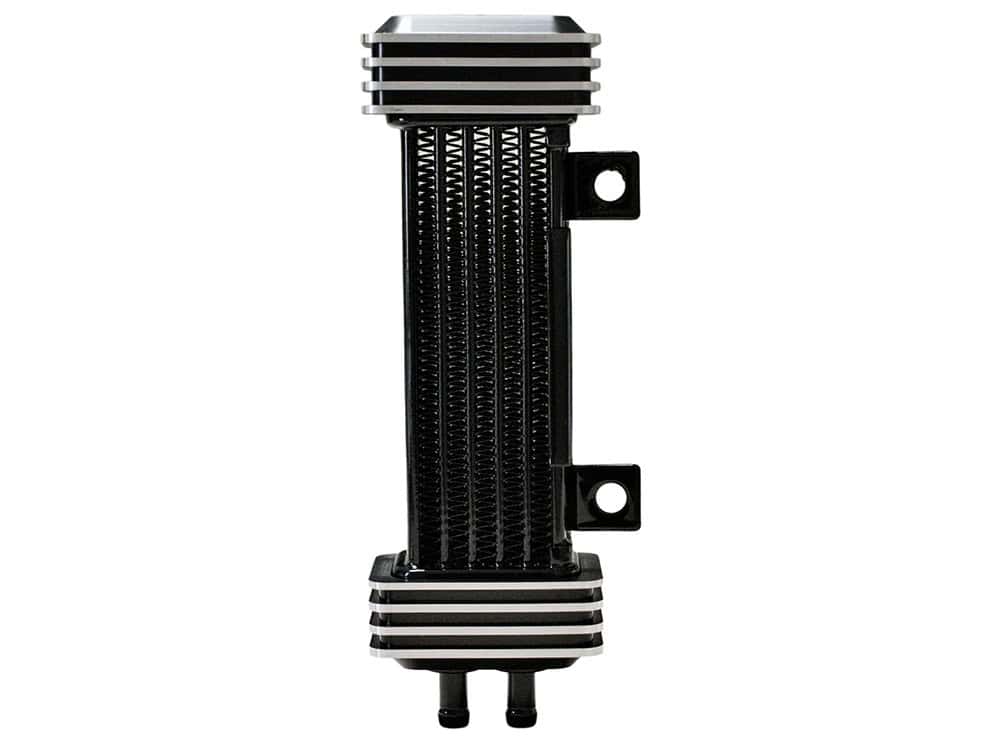 The cooler mounts to the left frame down-tube, spaced away from the frame to allow airflow to both the oil cooler and engine’s cylinders. The cooler is mounted to the frame using un ique, highly-durable, Uralite mounts which have a shock-absorbing effect and clean styling. The Deluxe Oil Cooler’s, six-tube, two-pass design offers three-times the cooling surface than our closest competitor. Special in-line turbulators add to the cooler’s efficiency with minimal oil pressure loss or restriction. Aluminum construction with durable powder coated finish. Billet aluminum end caps with machined fins match and complement the style of the engine’s cooling fins.
