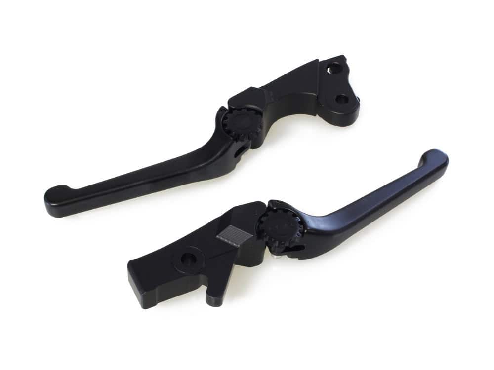 Comfortable black motorcycle clutch and brake levers for Harley Davidson bikes.