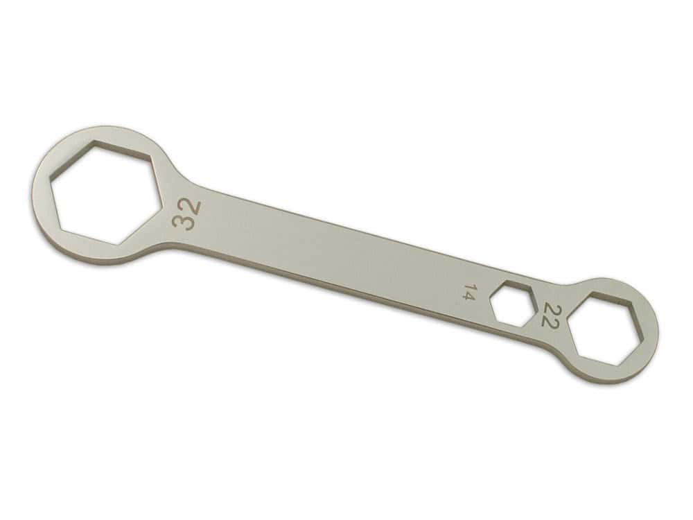 Developed for motorcycles, this 14x22x32mm axle wrench is perfect for removing front and rear axles during trail-side repairs or adjustments. Designed to be lightweight and compact for easy storage while offering enough leverage to get the job done while in the field. The 14mm size is good for most spark plugs. Chrome polished finish with laser-etched size markings.