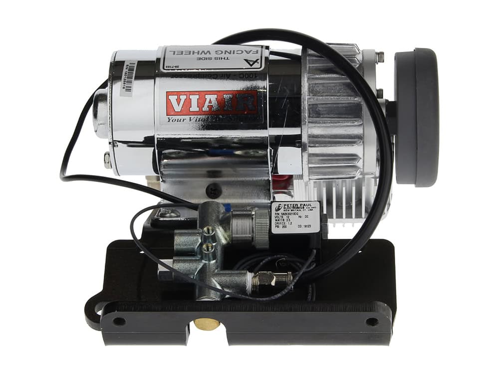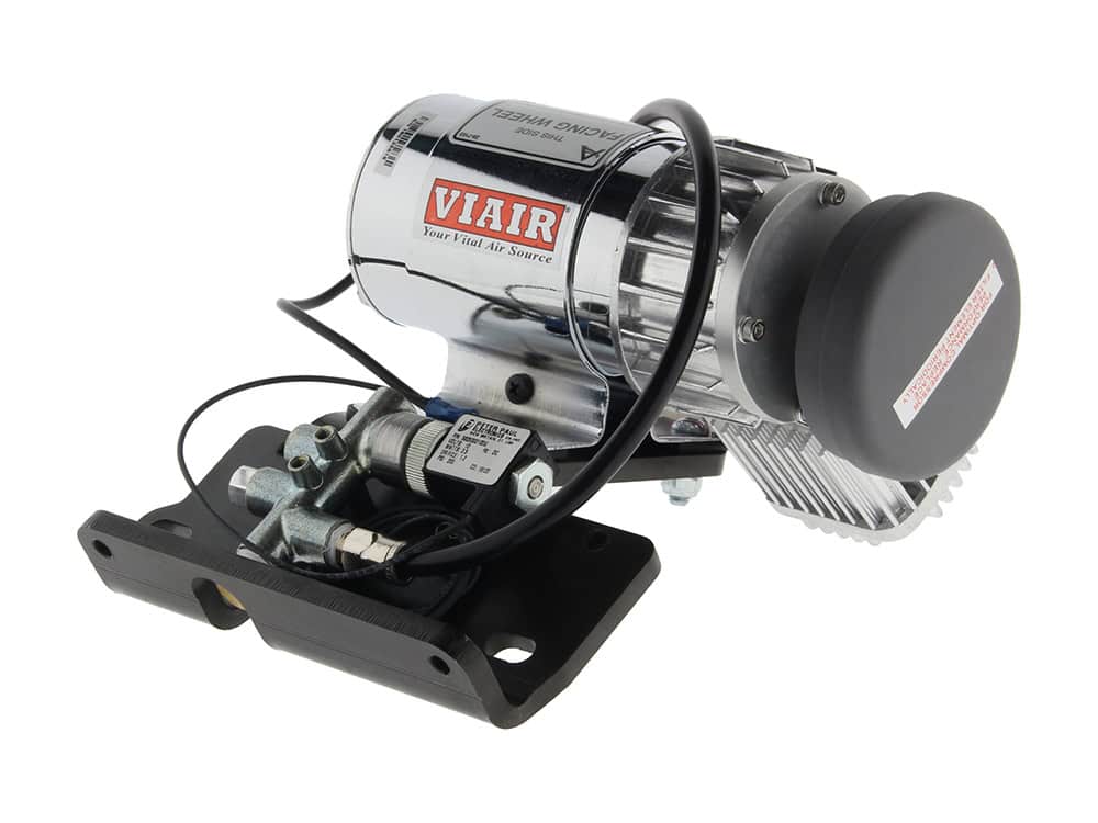 VIAIR air compressor for motorcycle pneumatic systems, compact and reliable.