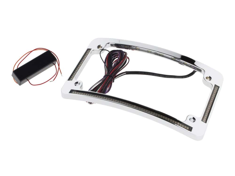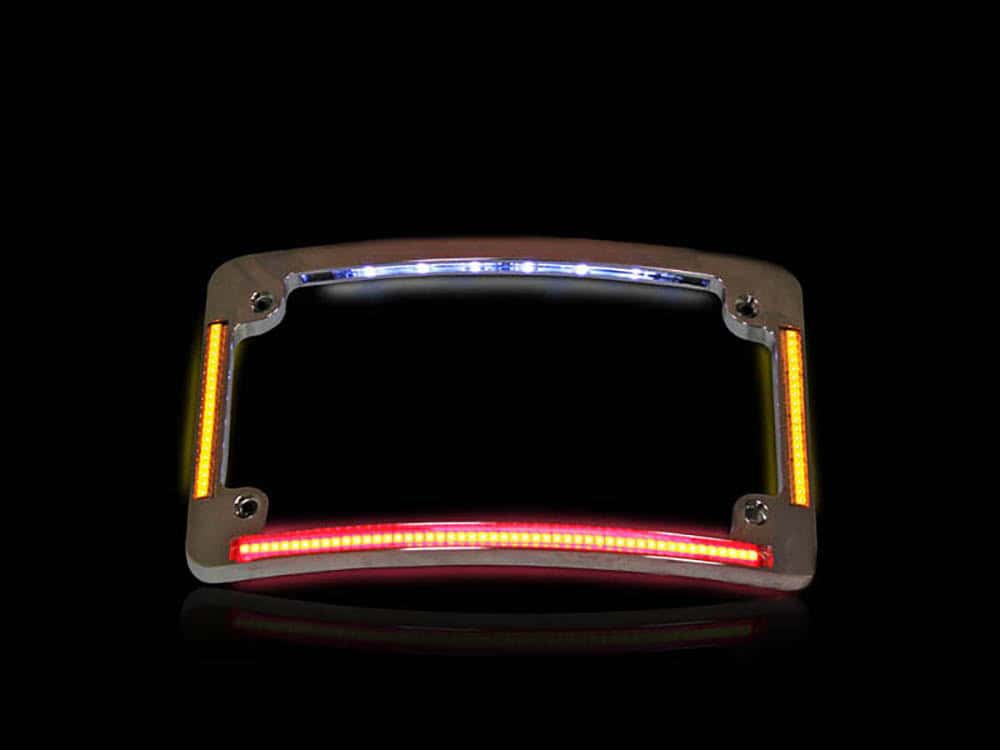 Curved Number Plate Frame with LED Amber Turn Signals & Red Brake Light – Chrome.