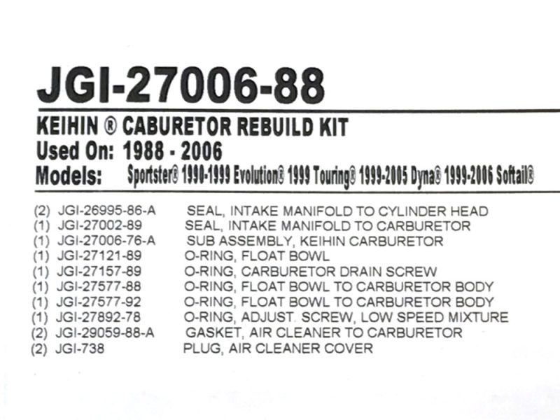 CV Carburetor Rebuild Kit. Fits Big Twin 1990-2006 & Sportster 1988-2006.