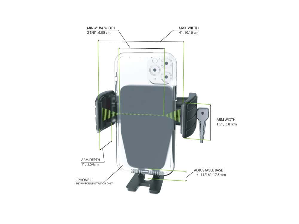 * Securely grips almost any phone including the case, Adjustable from 2-3/8″ wide to 4″ wide