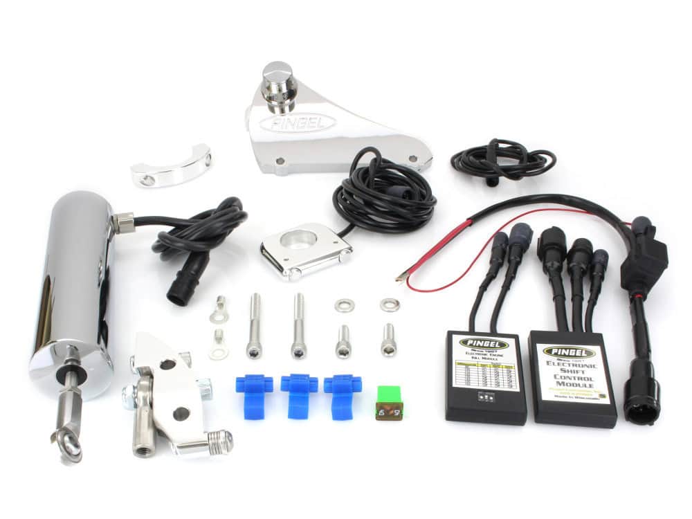Pingel Electric Speed Shifter Kits include a dual button handlebar control, a shift cylinder support bracket and the state of the art control module which sends a quick signal from the dual button handlebar con trol to the shift cylinder. Also included is the electronic engine kill module and step-by-step instructions with photos for an easy 2-3 hour installation.