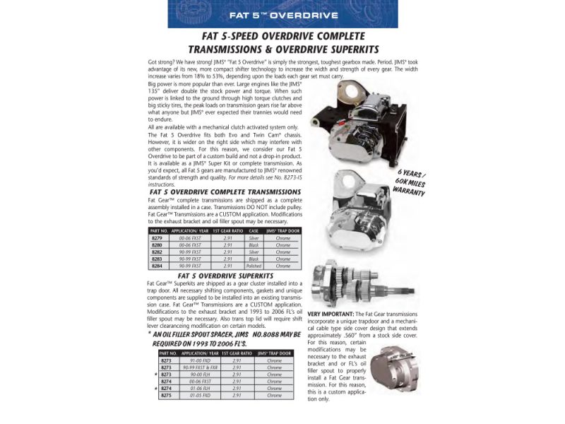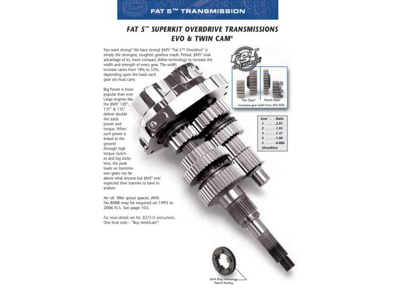 Got strong? We have strong! JIMS Fat 5 Overdrive is simply the strongest, toughest gearbox made. Period. JIMS took advantage of its new, more compact shifter technology to increase the width and strength of every gear. The width increase varies from 18% to 53%, depending upon the loads each gear set must carry. Big power is more popular than ever. Large engines like the JIMS 135Â’ deliver double the stock power and torque. When su ch power is linked to the ground through high torque clutches and big sticky tires, the peak loads on transmission gears rise far above what anyone but JIMS ever expected their trannies would need to endure. All are available with a mechanical clutch activated system only.