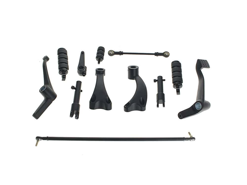 Lightweight black motorcycle control levers and footpegs, ideal for custom Revelry Motorcycles builds.