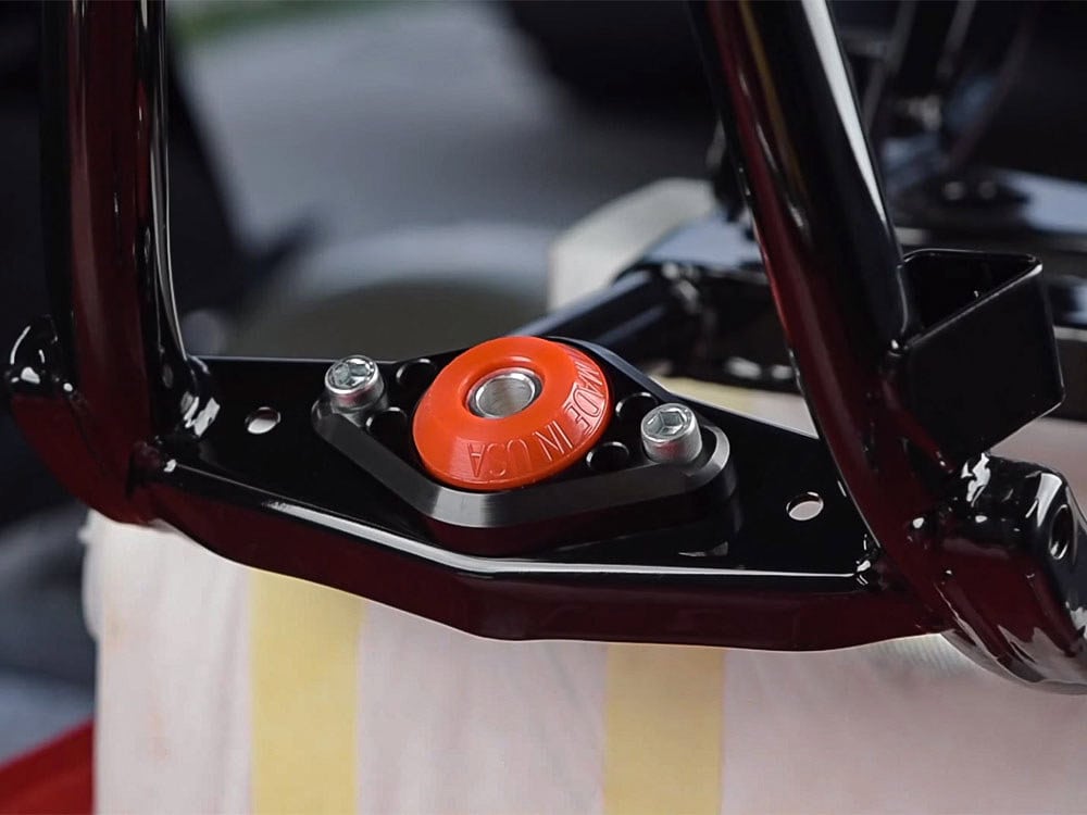 Rubber motorcycle engine mount with bolts for Revelry Cycles.