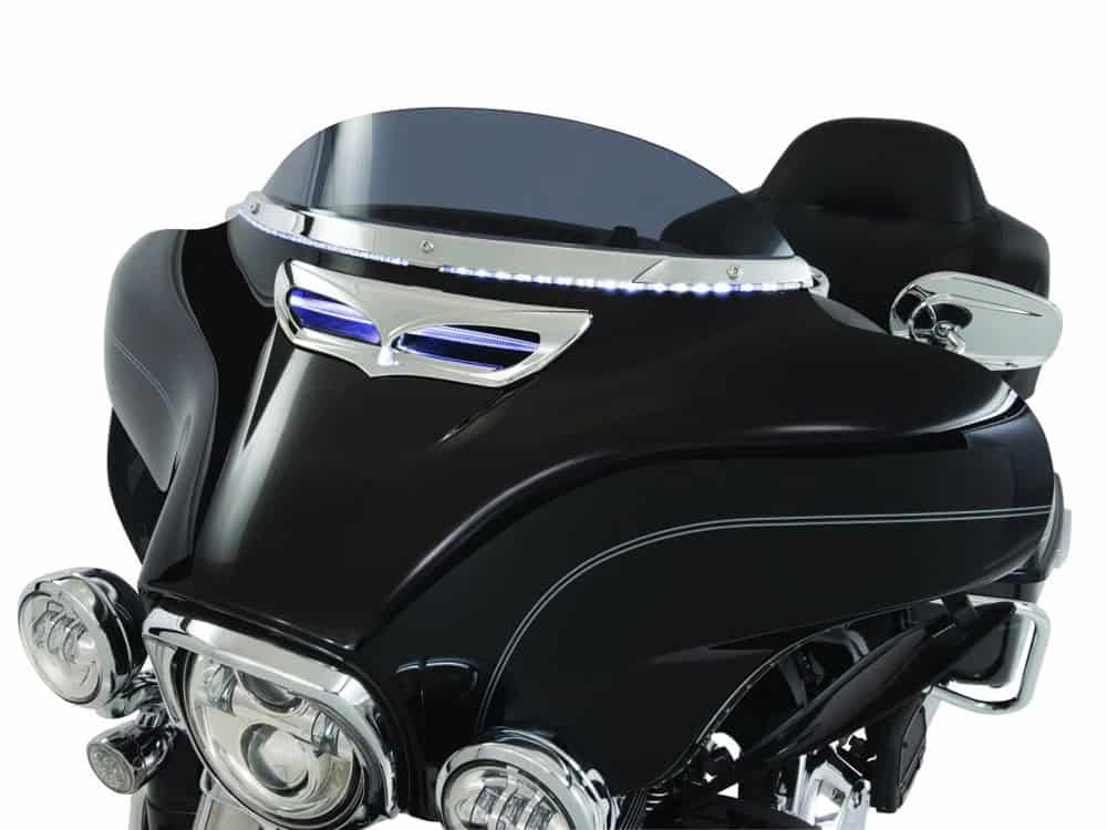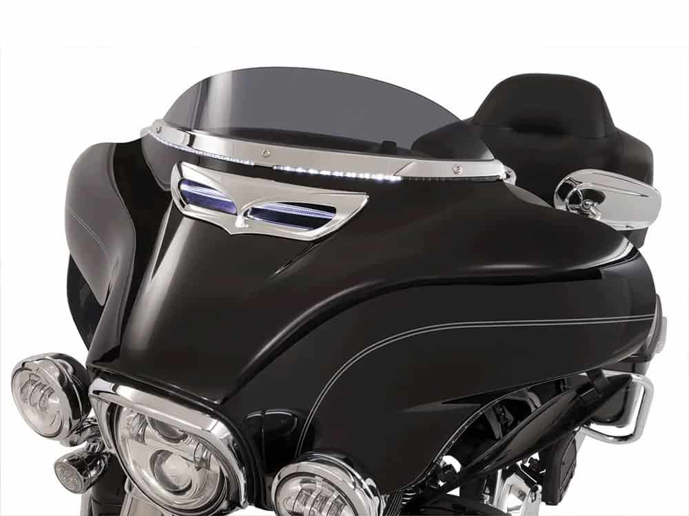 Pierce the night with the Ciro LED Lighted Horizon Windshield Trim. Clean and classy styling flows with the lines of your vented batwing fairing to enhance the look of the front of your motorcycle. Hidden LEDs illuminate the bottom edge with a bright white running light and amber sequential turn signals to increase visibility.