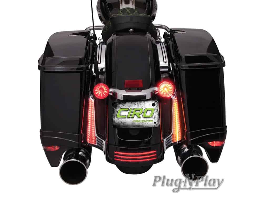 The Ciro Filler Panel Lights complete the rear end of your Harley-Davidson by adding red running/brake lights and amber turn signals to the stock filler panel area. This part dramatically increases visibility from the rear by incorporating an ultra-bright plasma amber turn signal along with red low intensity running and high intensity brake lights.