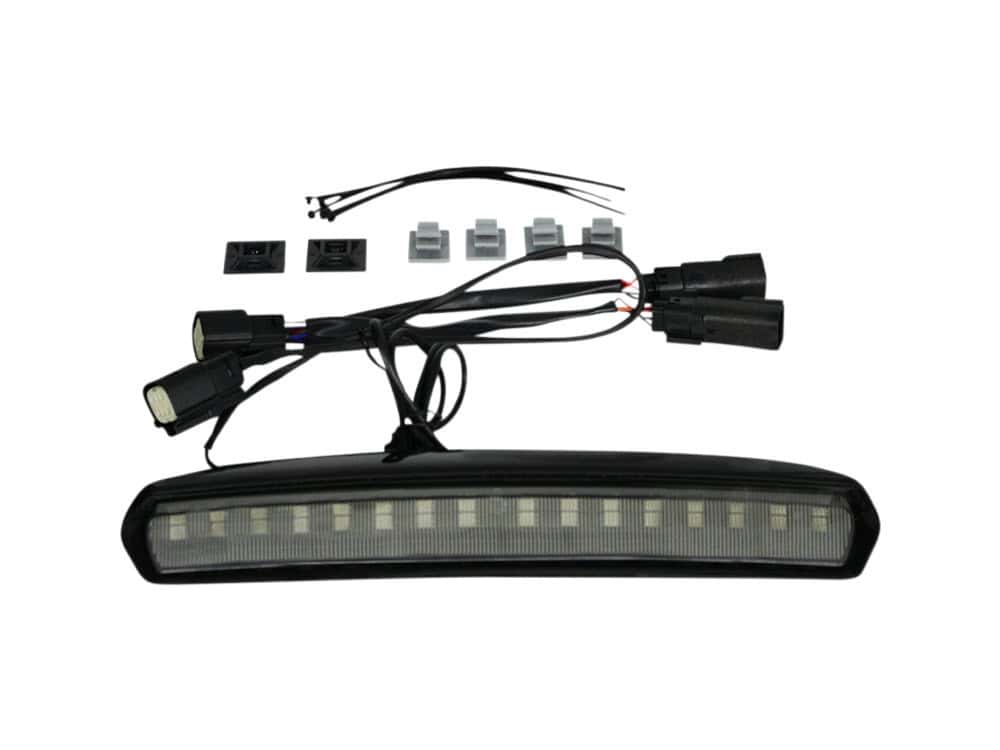 Add decorative visibility to the rear of your tour pack with the addition of our High Mount Tour Pak LED Light. Unit comes pre-taped to adhere to the top of the Harley-Davidson® 2014-current King & Chopped style tour paks. Includes plug and play wire harness for simple installation adding 32 50/50 LEDs for run and brake with 16 LEDs per side for red turn signal on most models.