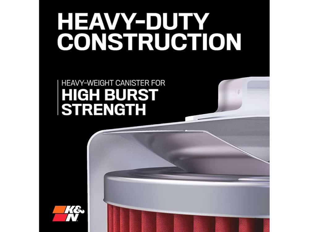 K&N premium oil filters for powersports vehicles utilize an innovative, highly efficient synthetic-blend filtration media. The heavy-duty canister is engineered to be exceptionally durable, and a 17mm welded hex nut can be used for quick and easy filter removal.