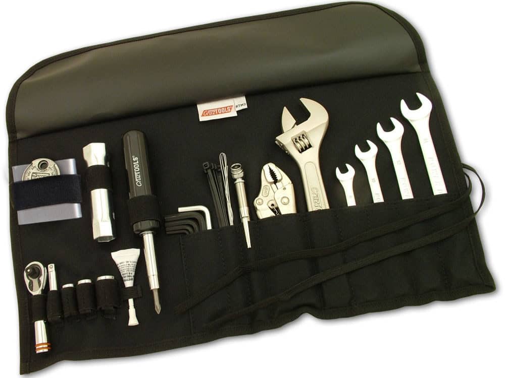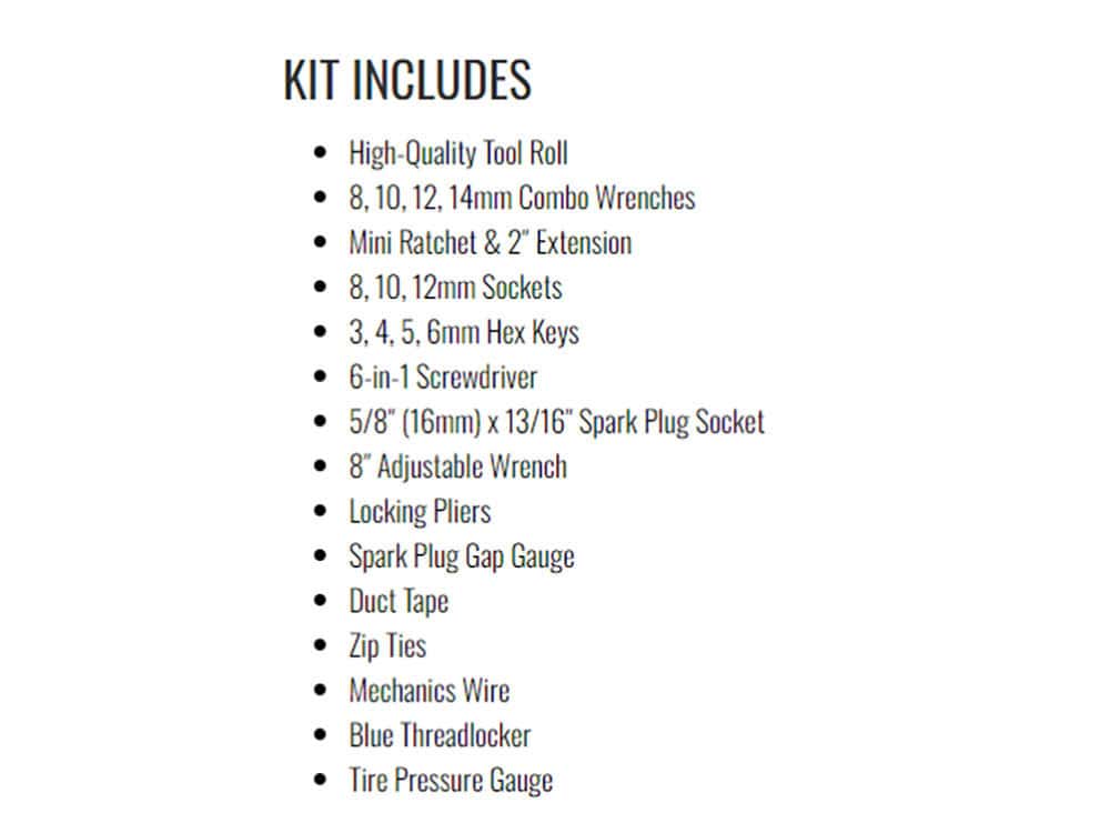The ultimate tool kit for any Japanese metric motorcycle, ATV or UTV. The M3 includes top-grade combination wrenches, an adjustable wrench, locking pliers, tire gauge, hex keys, 6-in-1 screwdriver and a mini ratchet and socket set. Also includes cable ties, mechanics wire, duct tape, and thread locker to provide exactly what you need for roadside repairs and trailside adjustments and is organized with a heavy-duty roll-up pouch.