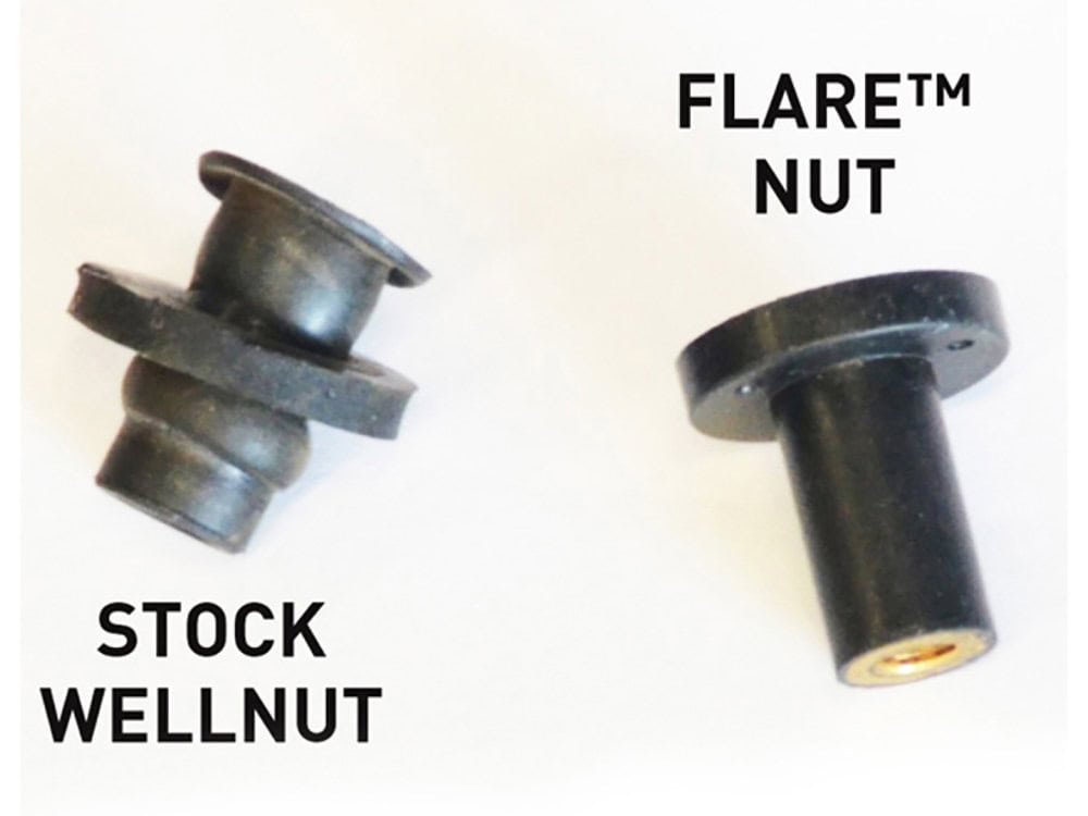 Factory well-nuts are prone to failure after a few uses. Klock Werks Flare™ Nuts are manufactured out of a superior material and have a revolutionary design, including a metal washer molded into the flange to prevent the well nut from pushing through the windshield mounting hole and ending up inside your fairing. In addition, we’ve added a superior brass threaded insert that tightens the well-nut, but allows for continuous installation and removal. These advantages ensure these are the last set of well-nuts you will need for your 1998-2013 Road Glide!